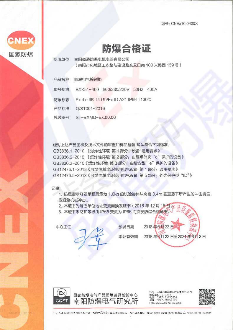 南陽盛通防爆電機電器有限公司作為一家專業科研與開發、制造、銷售防爆電氣控制柜廠家, 防爆控制柜通過國家防爆電氣產品質量監督檢驗中心認證,如您需要購買防爆電氣控制柜或者了解防爆電氣控制箱(柜)價格,請來電咨詢,我們將竭誠為您服務!