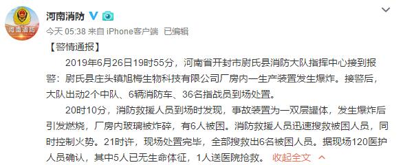 據(jù)河南省消防救援總隊官方微博消息,6月26日19時55分,河南省開封市尉氏縣莊頭鎮(zhèn)旭梅生物科技有限公司廠房內(nèi)一生產(chǎn)裝置發(fā)生爆炸,有6人被困。經(jīng)搜救,其中5人已無生命體征,1人送醫(yī)院搶救。